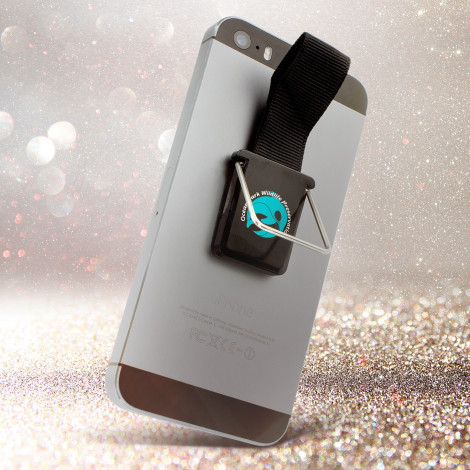 Slimline plastic phone grip which adheres securely to the back of a phone or phone case. It has a soft woven polyester loop which provides a secure finger grip and a metal phone stand that swivels out when required.