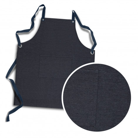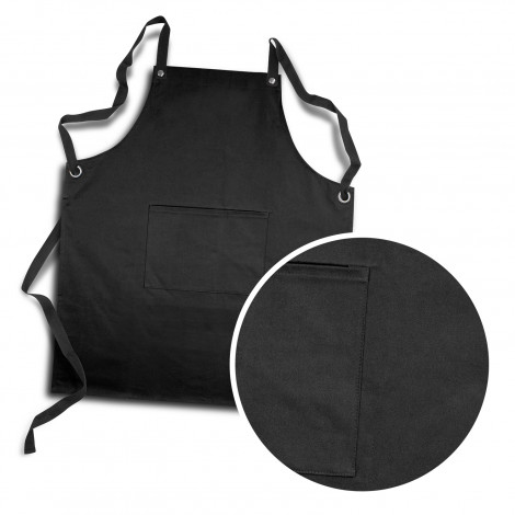 Fashion inspired 280gsm cotton bib apron with a medium pocket on the front and gunmetal rivets. It has interchangeable coloured cotton straps which cross over at the back for an adjustable fit. The straps feature a gunmetal dome for easy removal of straps.