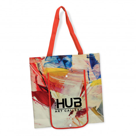140gsm cotton tote bag which can be folded down into a snap closure pouch for easy storage. When unfolded, the snap closure also functions as a front storage pocket. The handles, binding and stitching are available in 16 colours which will match unless requested otherwise. Georgia is completely customised with full colour branding on both sides as well as the snap closure pocket. A lead time of 20 working days applies to this product.